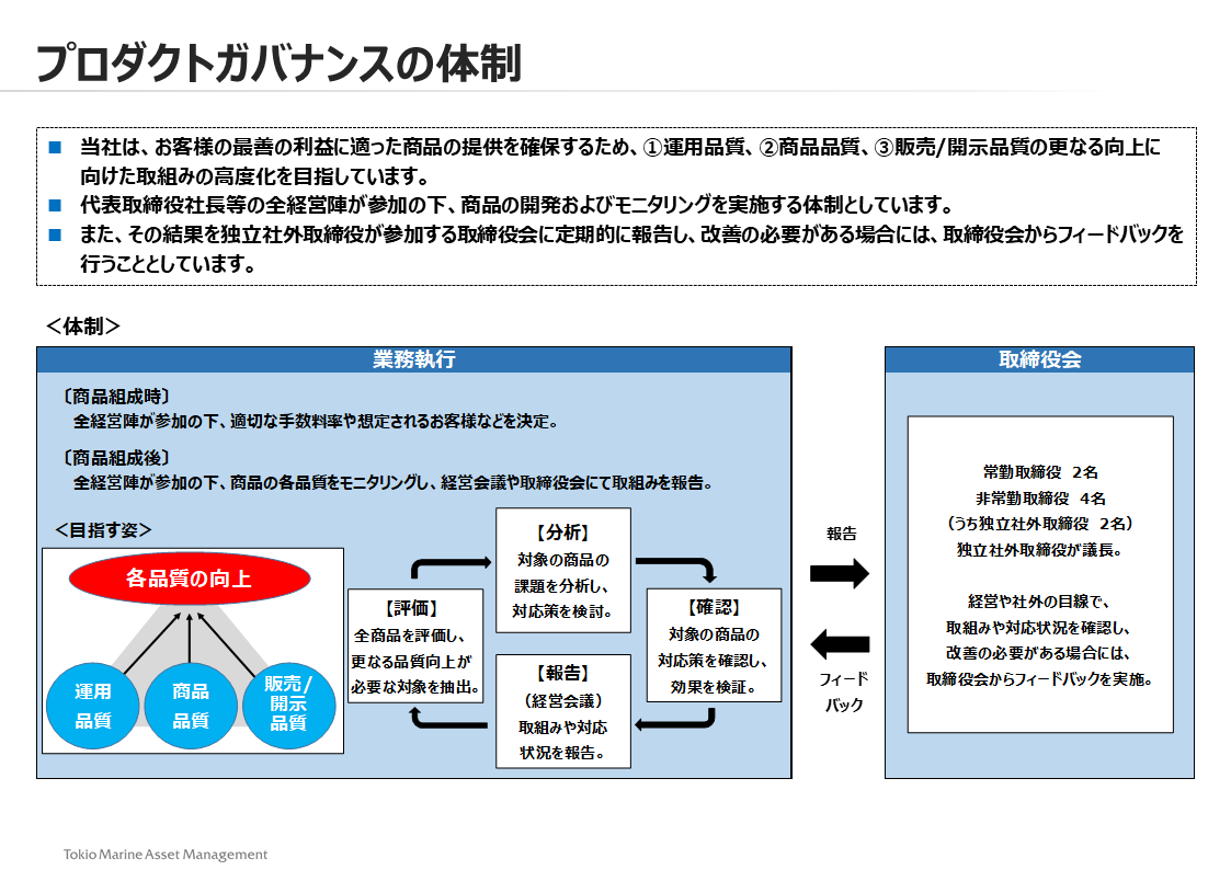 当社は、お客様の最善の利益に適った商品の提供を確保するため、①運用品質、②商品品質、③販売/開示品質の更なる向上に向けた取組みの高度化を目指しています。