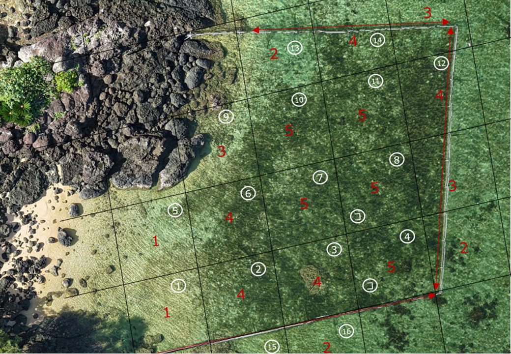 ドローンを活用した空撮写真および水中写真から藻場再生の「面積」と「被度」を正確に計測し、精度の高いモニタリングを目指しています。