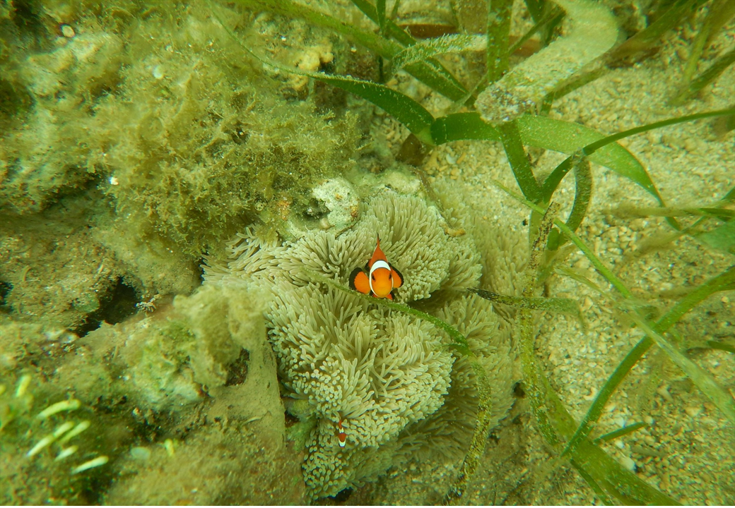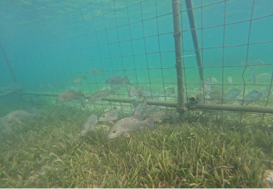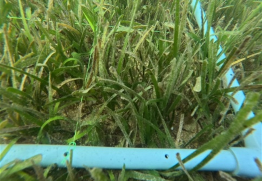 保護柵の外では海草が消失し砂漠のような光景が広がっていますが、海草が再生した保護柵内では多くの海洋生物を観察することができました。