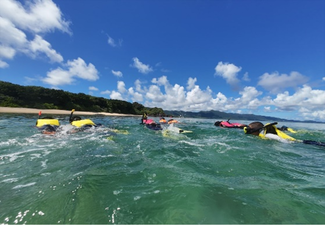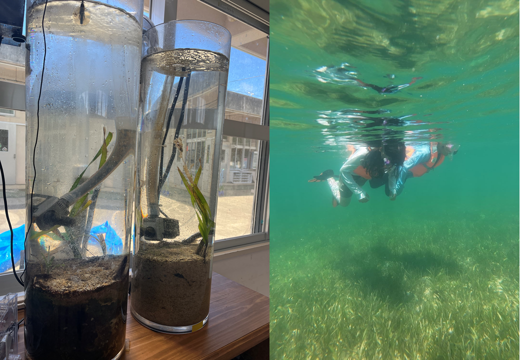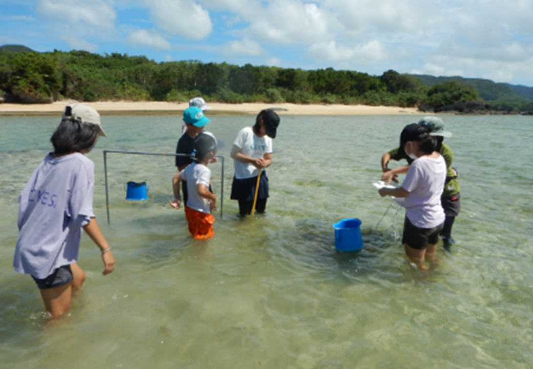 そこで、保全活動に協力いただいている野底小学校ではシュノーケルで現地を視察し、ウミショウブの生育や健康な海草藻場ではどのような生物が暮らしているのか等を観察しています。また、教室に陸上水槽を設置することで、世代を超えて子どもたちにウミショウブの育成を身近に感じてもらう活動を行っています。