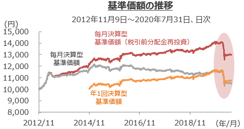- ※ 基準価額は毎月決算型の基準価額(税引前分配金再投資)で、信託報酬控除後、1万口当たりの価額です(以下同じ)。年1回決算型の運用実績については、下記リンク先および月次報告書でご確認ください。