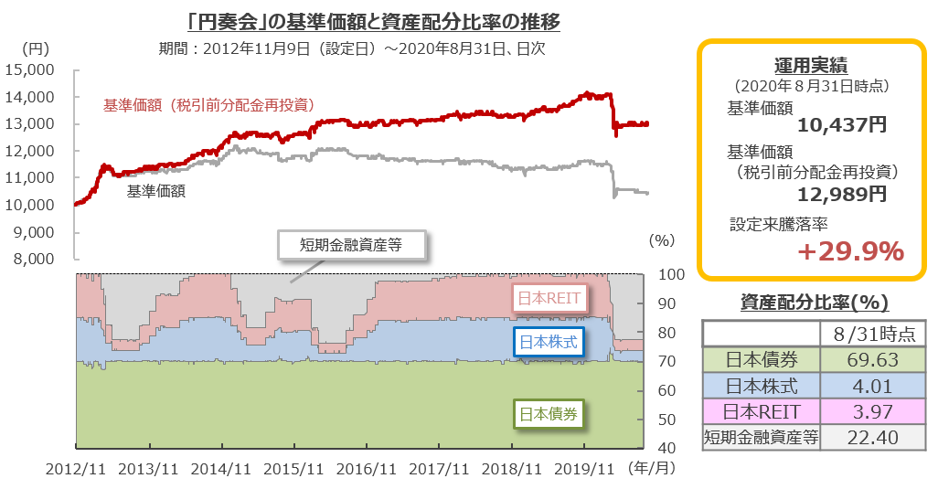 以降、円奏会は「守りを重視」したポートフォリオで運用を行っており、日本株式・REITの組入比率は8月末時点でそれぞれ4.01%、3.97%と低位を維持しました。