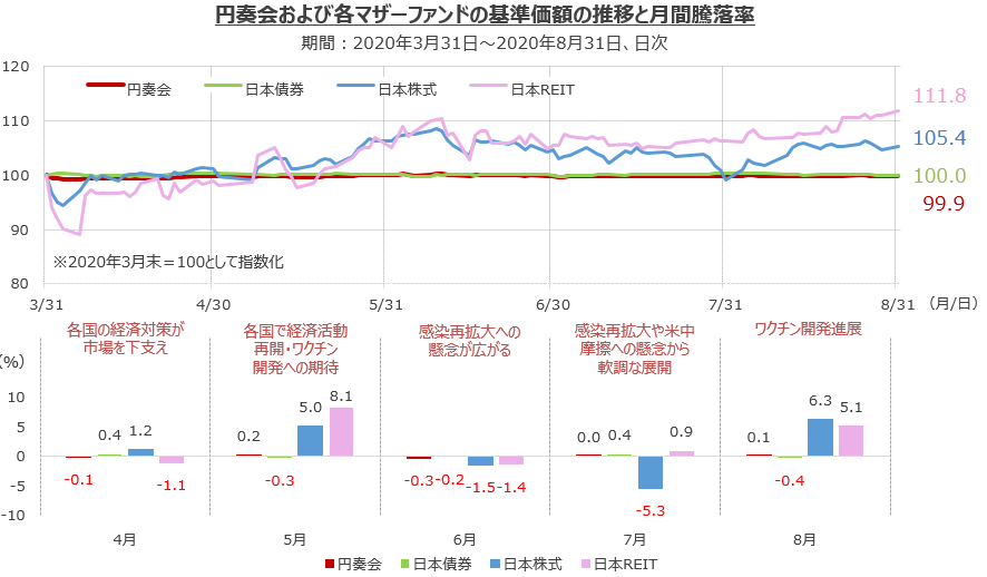コロナショックの市場の混乱がやや落ち着いた2020年3月末以降の各マザーファンドの騰落率を見ると、8月末時点で、日本債券(東京海上・円建て投資適格債券マザーファンド)は横ばいの0.0%、日本株式(東京海上・高配当低ボラティリティ日本株マザーファンド)は+5.4%*、日本REIT(TMA日本REITマザーファンド)は+11.8% となりました。