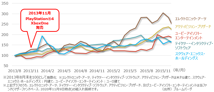 過去、「PlayStation®4」と「Xbox One」が発売された2013年11月以降、主なゲームソフト関連会社の株価は良好な業績を支えに堅調に推移したこともあり、今回も中長期的な企業業績へのインパクトが注目されます(後述)。