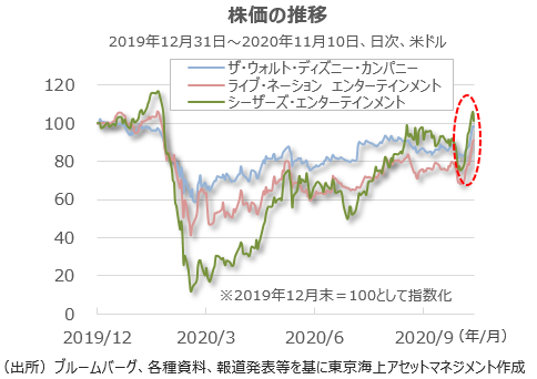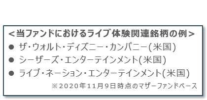 米医薬大手ファイザー社の新型コロナウイルス感染症ワクチンの高い有効性が確認されたとの報道を受け、エンターテインメント業界では、今後の人々のアウトドアな消費行動に期待を寄せています。そのようななか当ファンドでもライブ体験分野における、銘柄にも注目しています。