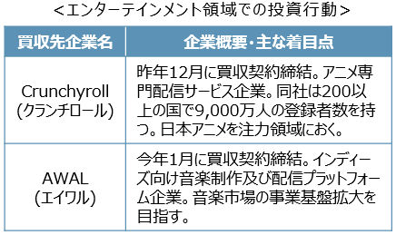 プレイステーション®5の販売、音楽制作・ストリーミング配信、昨年大ヒットしたアニメ事業などが好調であったことが、増収増益に繋がりました。映画分野では、コロナ禍による映画館運営苦のため通期で減収の見込みですが、広告費の減少やホームエンターテインメント向けサービスによる増収により、通期の予想営業利益が前年度比5.6%増に上方修正されました。また、エンターテインメント領域に戦略的な投資も行っています。