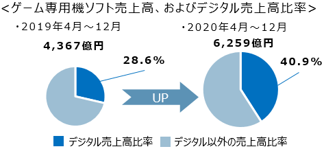 同社は2月の決算発表にて「Nintendo Switch」の2020年度通期の予想販売台数を、前年度比26%増の2,650万台に引き上げました。そして2020年度の予想売上高を、前年度比22%増に上方修正しました。また、ダウンロード形式のデジタル売上高*の伸びは売上総利益率の上昇に寄与しました。